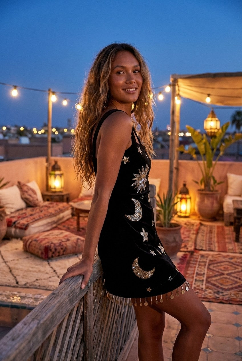 A statement mini dress designed with celestial details and a sleek silhouette that captures attention effortlessly.