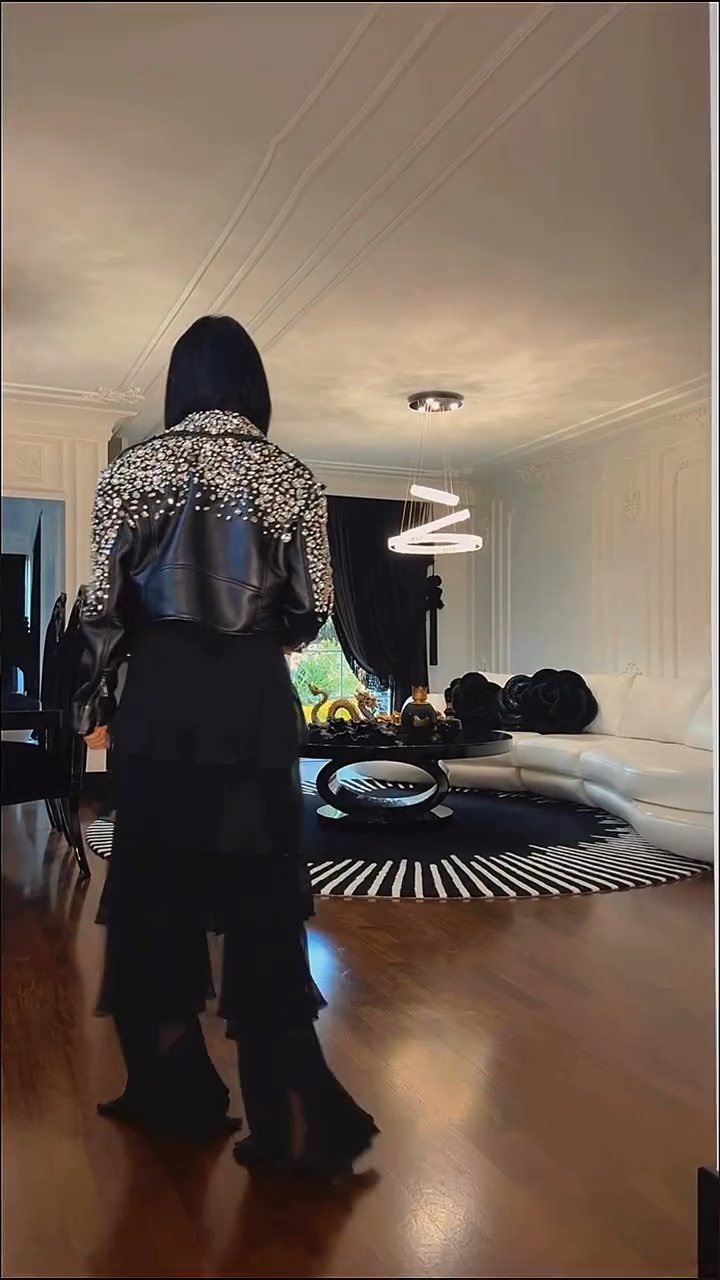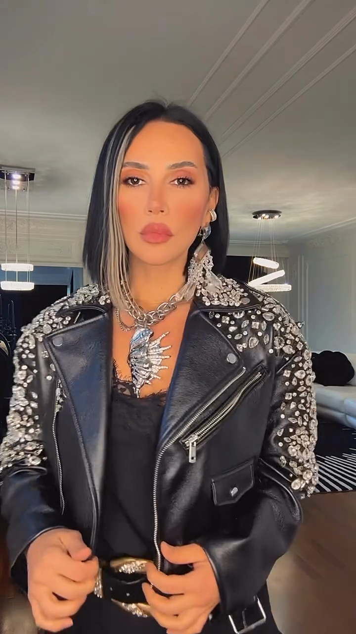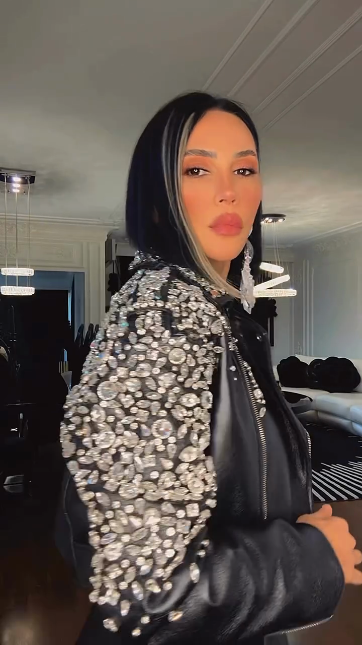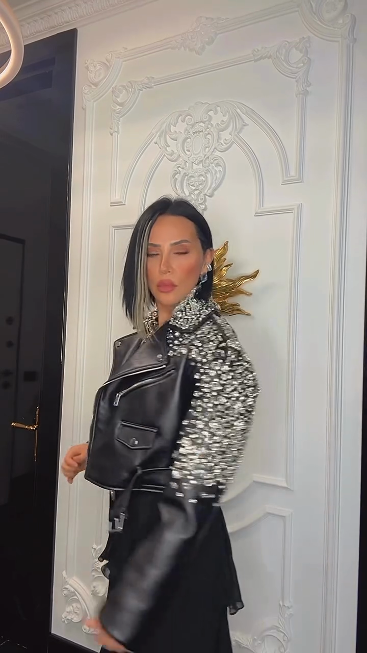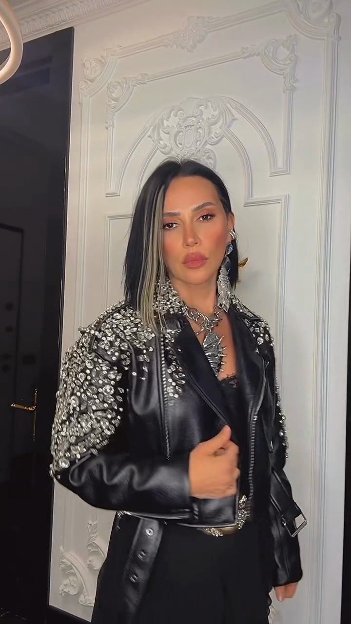 This black leather biker jacket is adorned with an abundance of sparkling rhinestones and studs, primarily concentrated on the shoulders and sleeves, creating a glamorous and edgy look. Paired with a black lace - detailed top underneath, and accessorized with multiple statement necklaces and large earrings, it's suitable for a night out, a special event, or any occasion where making a bold fashion statement is desired.
