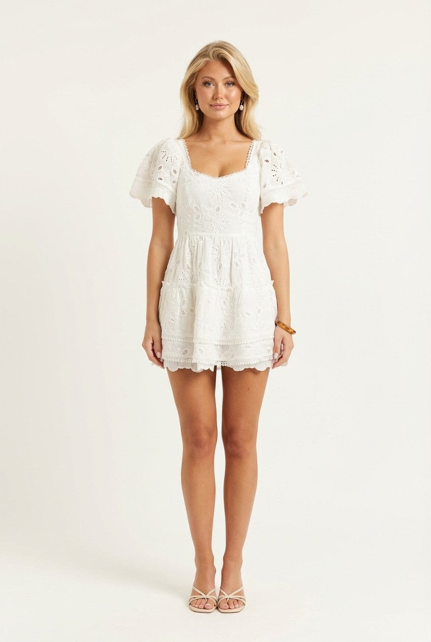 The Lumière Lace Mini Dress captures the essence of summer with delicate textures and a flattering, feminine silhouette made for sunlit moments.