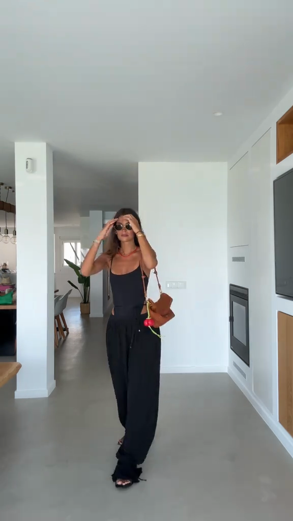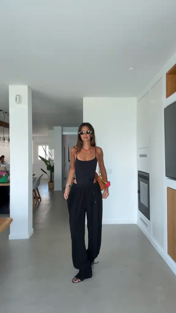 This black openwork vest and drawstring harem pants set elevates a minimalist, avant-garde style with its smooth texture and effortless coolness.
