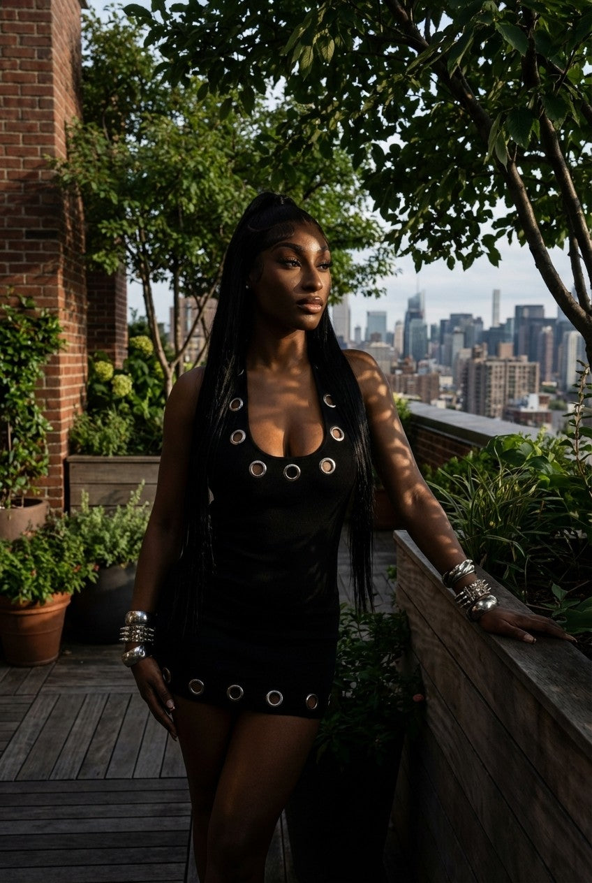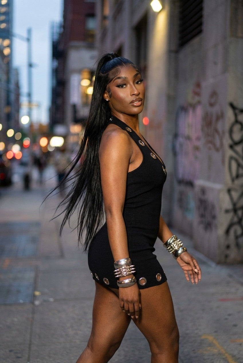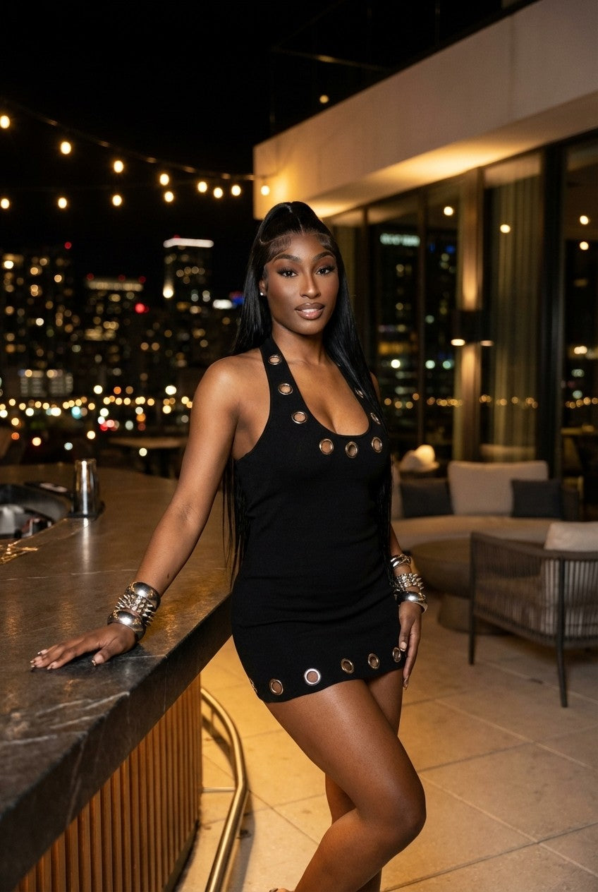 The Midnight Muse Bodycon Dress is designed to sculpt, define, and captivate, featuring bold metallic accents that elevate your after-dark presence.