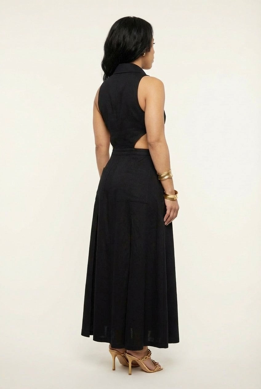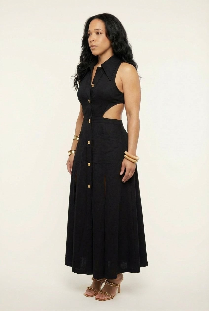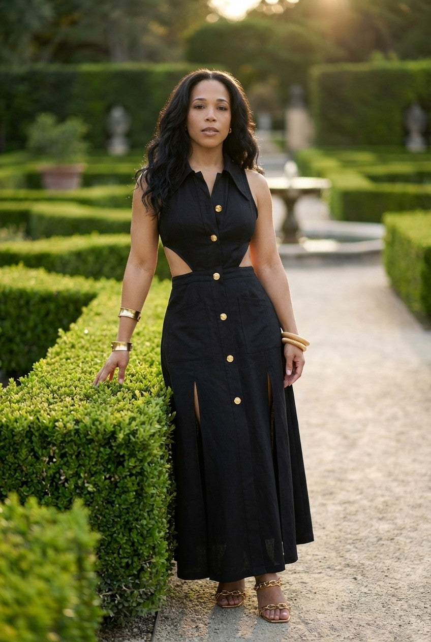 This buttoned midi dress blends classic tailoring with effortless femininity, creating a refined silhouette that transitions seamlessly from day to night.