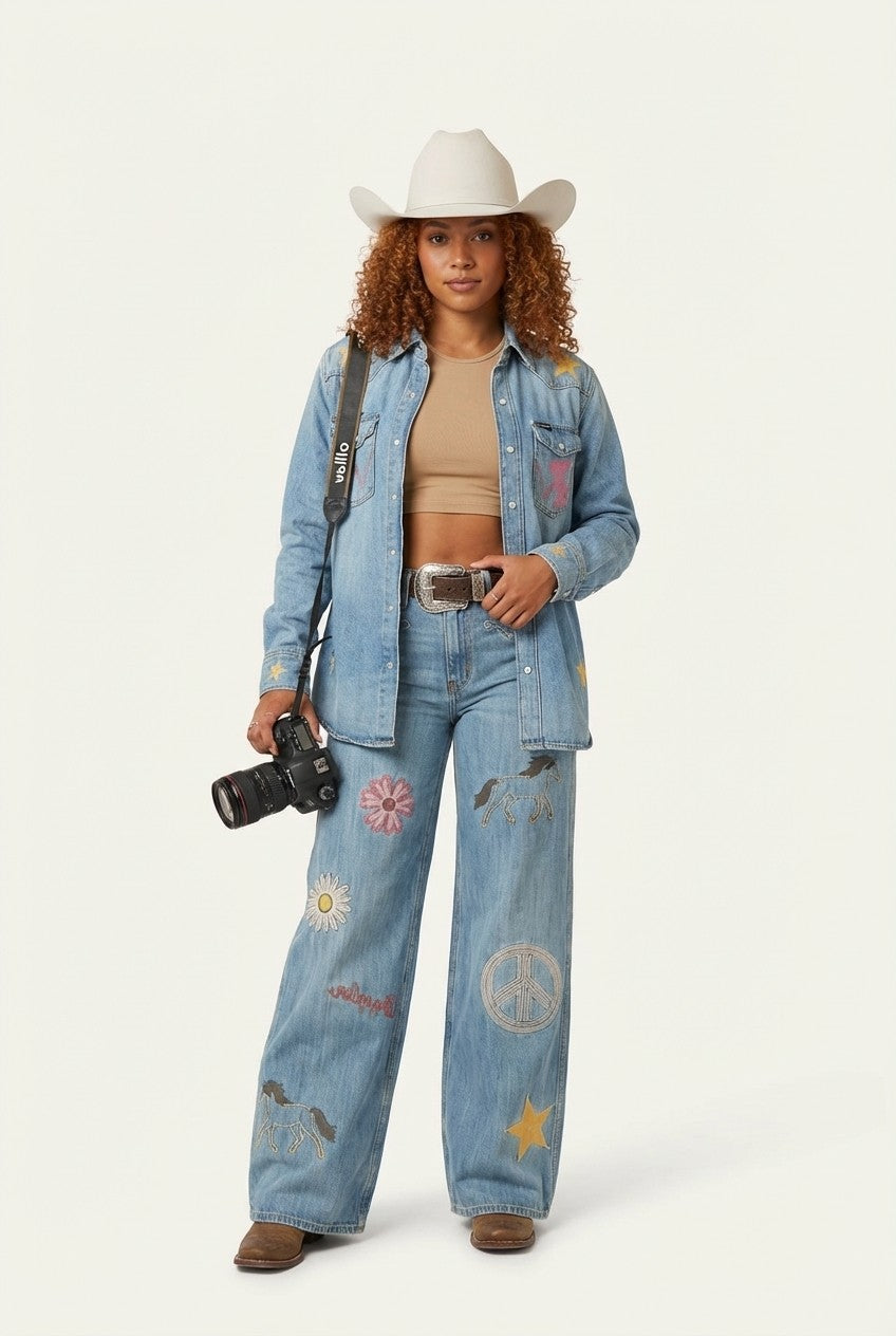 Bring effortless western charm to your wardrobe with this unique embroidered denim two-piece set. Featuring a classic denim shirt paired with wide-leg jeans decorated with playful embroidery, this outfit blends vintage cowgirl style with modern comfort.