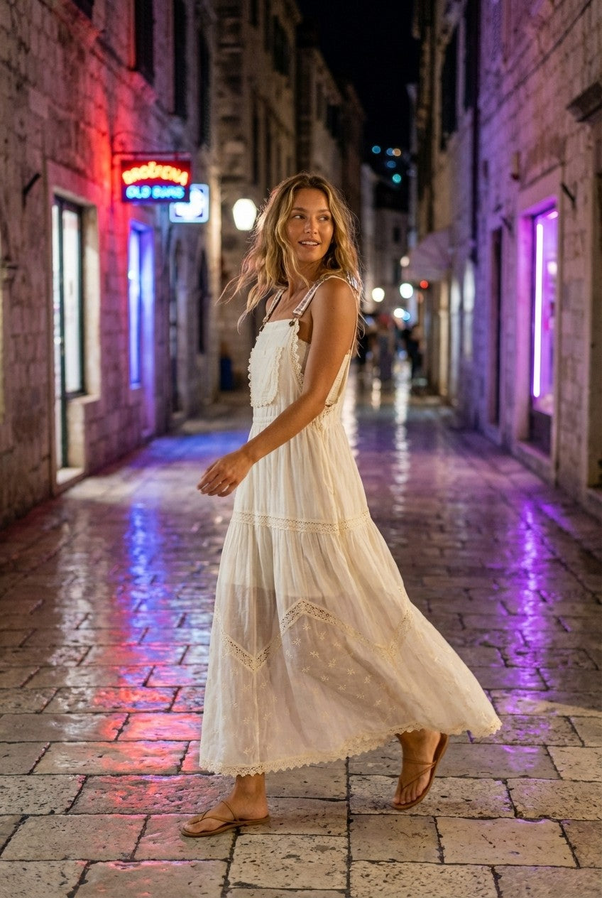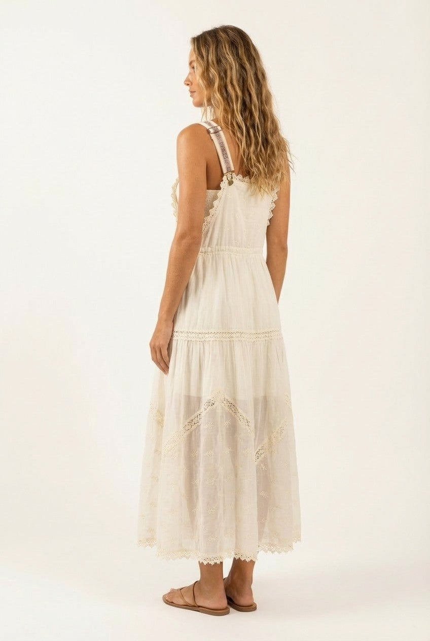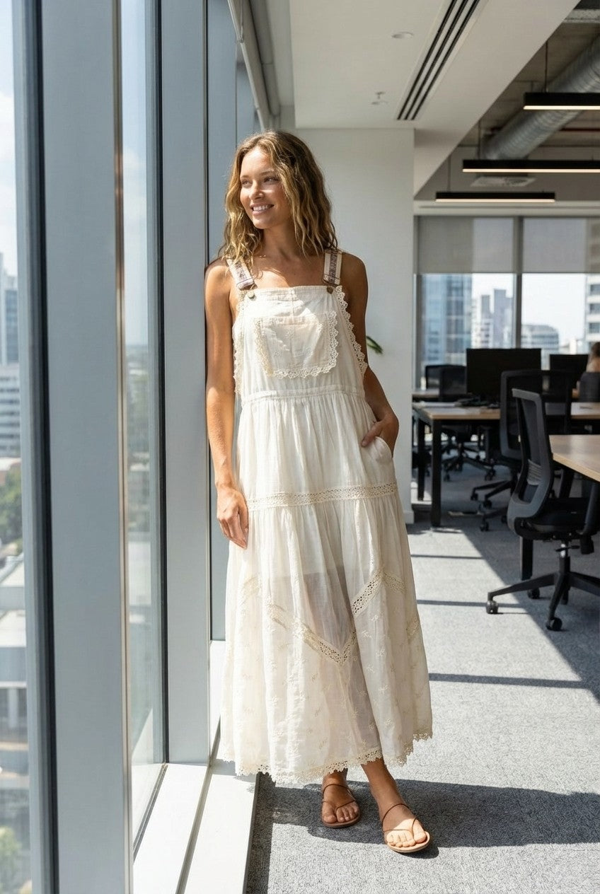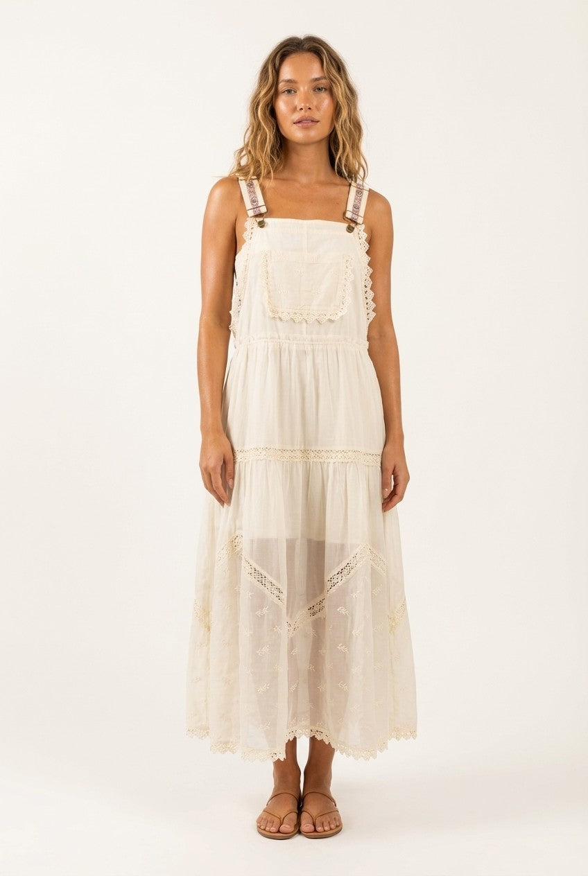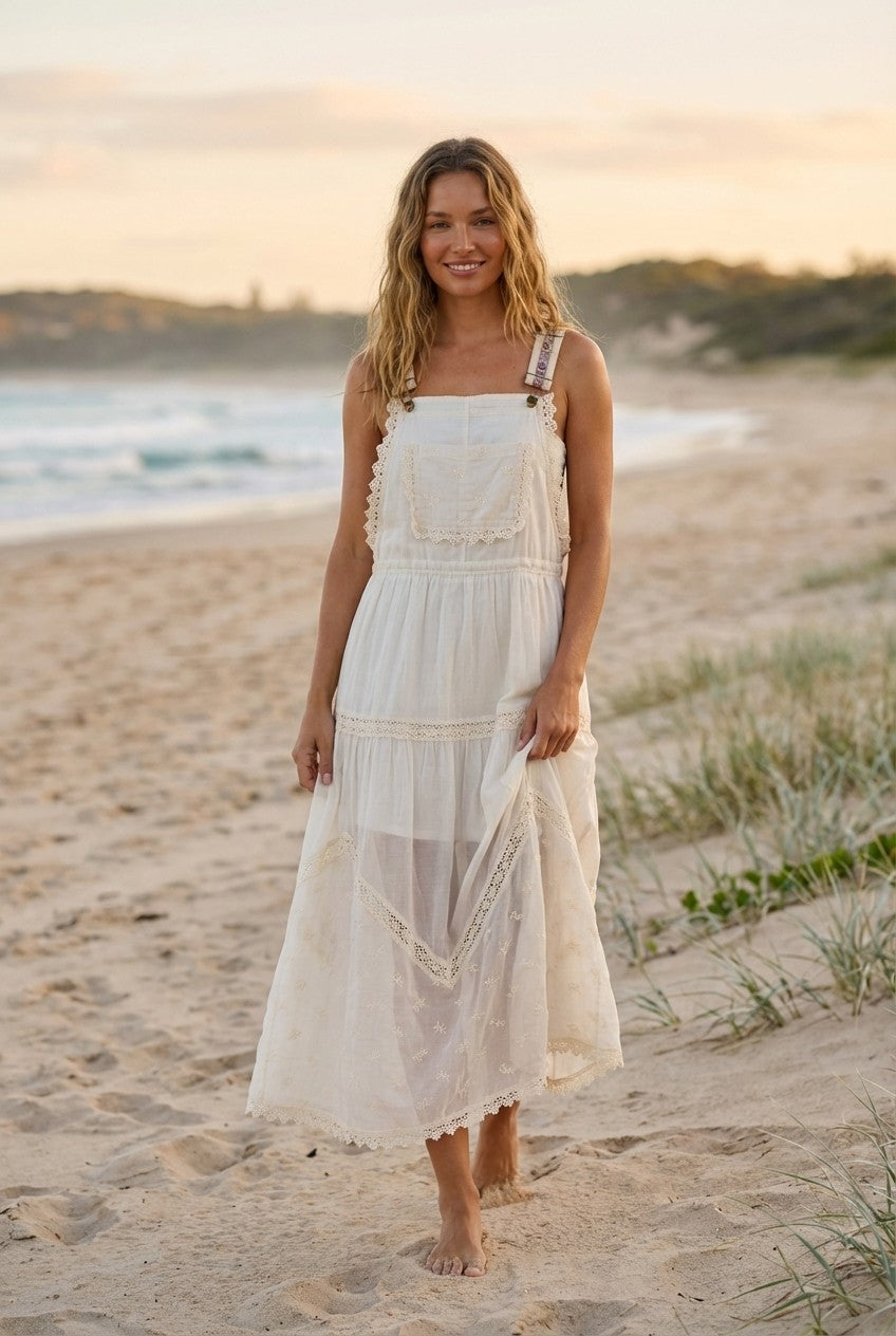 Embrace the effortless charm of summer. This beautifully crafted maxi dress combines the playful silhouette of overalls with delicate lace detailing for a truly unique bohemian aesthetic that feels both timeless and fresh.
