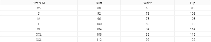 | Hips | 89 | 94 | 99 | 104 | 109 | 114 |